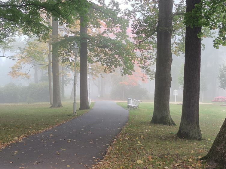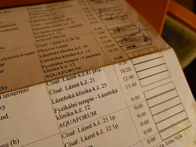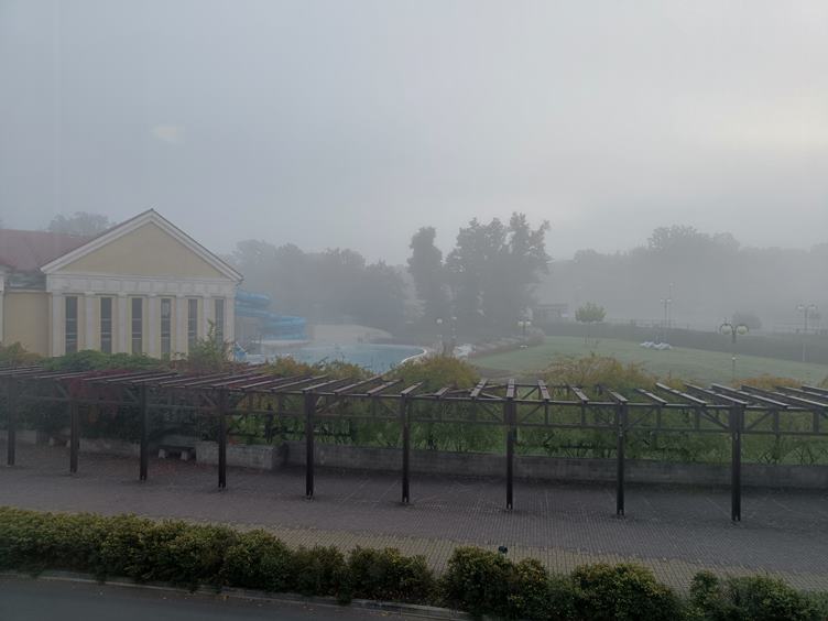 Čekám na uhličitou koupel. Venku je mlha, že by se dala krájet. Budu v ní muset projít do plynu. Neboli do plynové koupele, kde to vypadá, jako bych si neuměla sednout správně na záchod. Cestou zpět potkávám hrající si veverky (hledejte). Jsem unavená, a tak trávím odpoledne v posteli. Po večeři jdu hrát kulečník. Před spaním trávím čas přípravou logistiky na druhý den. Samozřejmě péče o jizvy.