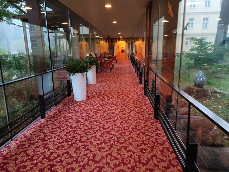 Skleněnou chodbou na procedury. Čekám na cvičení. Po procedurách se jdu projít. Rychle jsem si vyšlápla na Ameriku, kde mají pár zvířátek a rybník s pěkně barevnou hrází. Zpět to beru okolo Františka a pod nohy mi padá listí. Před večeří jsem stihla bazén. Utahaná jdu skleněnou chodbou na pokoj.