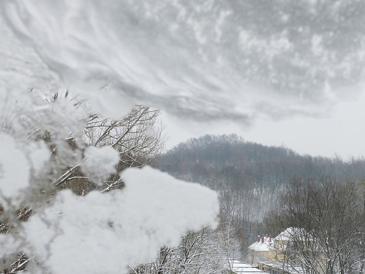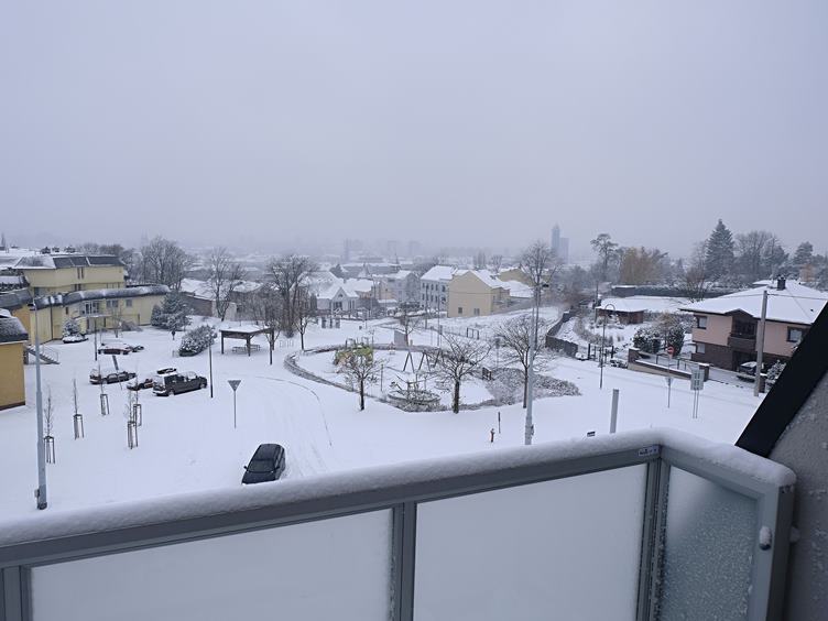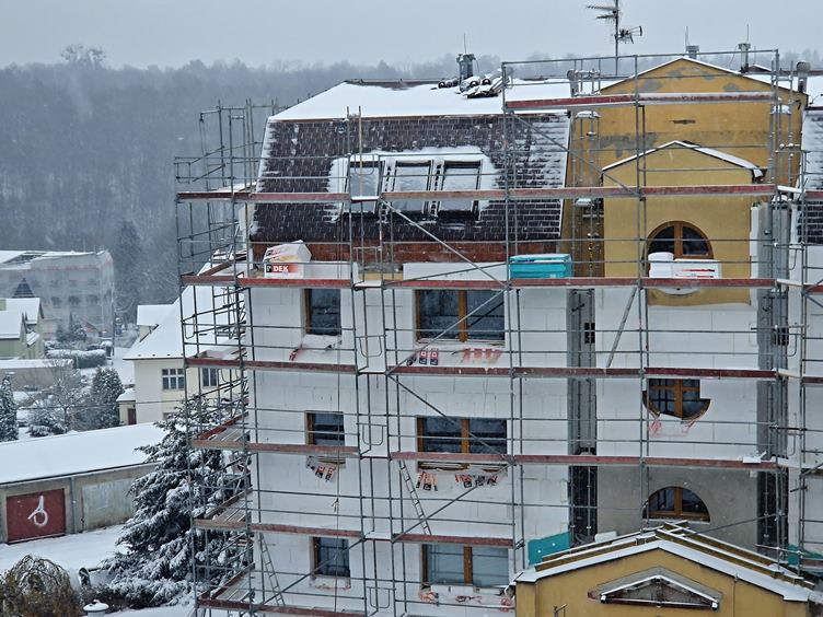 Je to tady, z okna to vypadá poeticky … akorát stavaři (a my také) budou mít problém … zapomněl jsem vyklidit balkon … zítra se budou čistit koberce, tak připravujeme byt … a také byly v plánu střešní okna … dostat z rámu zbytky lepící pásky není jen tak, ono to tam bylo čtyři měsíce … horký vzduch, benzín, plastová karta a fůra času to řeší … ještě rozeberu radiátory na zítřek … město vysílá kouřové signály …
