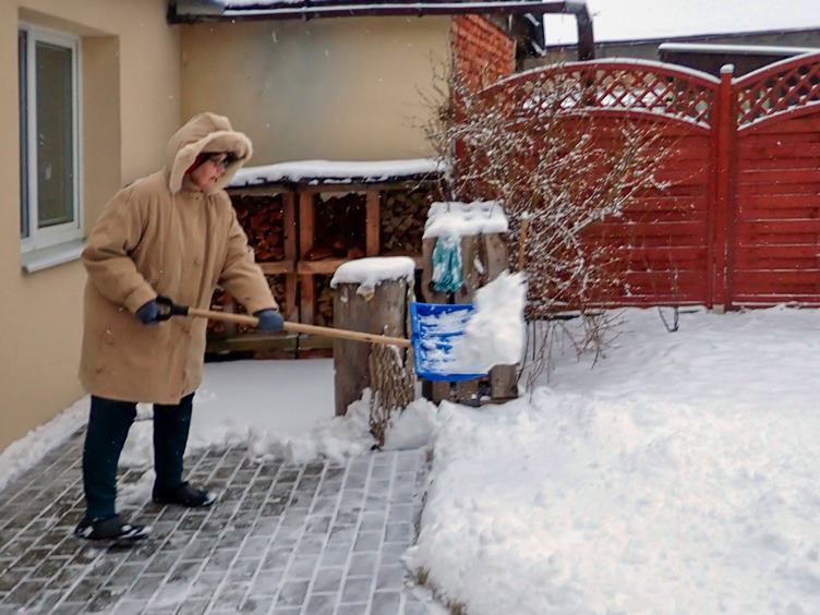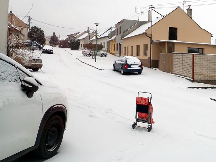 Ráno léky... V poledne polévka... A pak tlusté ponožky a sníh... Stančin nákupní vozík se na sněhu pěkně vyjímá... Soused Petr šel odházet sníh z auta a naše kočka Linda hned za ním - prý vždycky, když přijíždí, Linda za ním vybíhá... Nahoře vpravo odhazuje sníh Miluška... Žena s hrabadlem na dvoře... A večer krásný dlouhý film Cesta do Indie - tam naopak měli vedro...
