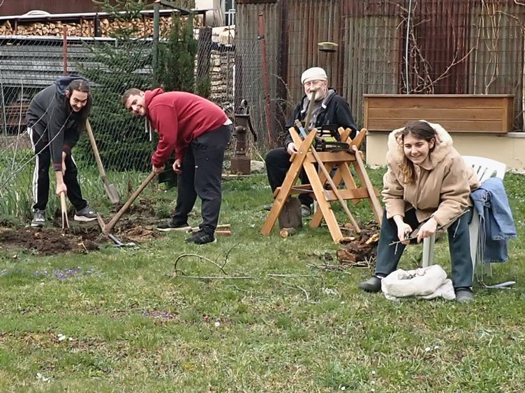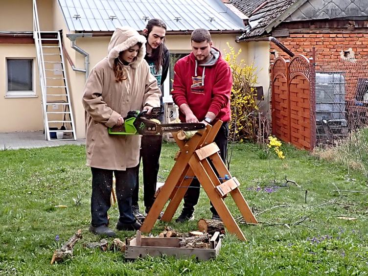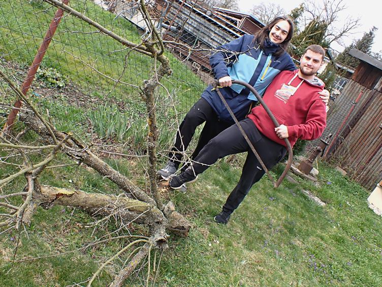 Boty, papuče a jiné bebechy z průjezdu ven! Bude kontrola plynového kotle!... Hořák v pořádku... Únik plynu žádný... A faktura... Odpoledne kácení uschlé meruňky... Pilou ruční i elektrickou... Zahrabání jámy, nařezání polínek a nastříhání větviček na zátop... Aktéři: Ondra, Jirka, Hanička a já - děda sedící radící... Bohužel, někdo z nás nepozorných na trávníku ulomil modrou ladoňku - naaranžoval jsem ji ke kamínkům...