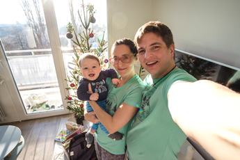 I mezi svátky se jde ráno do bazénu. Máme nová trička. Toník zkoumá stromek u našich. Toník s prababičkou. Společné foto. To je dárků. Toník dostal svíticího medvěda. Táta a brácha.