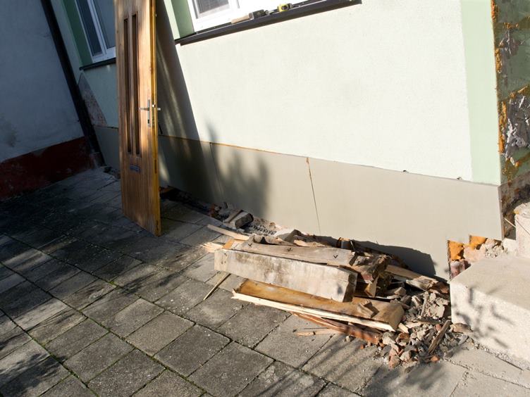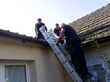 Chodníková komise... Linda... Instalace předních dveří... Je krásně, na obloze se prohánějí tryskáče... Staré dveře pryč... V úžlabu klempíři vyměnili lepenku za plech.... Nové dveře a okna do dvora a do dědiny...