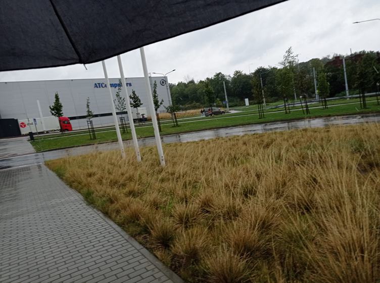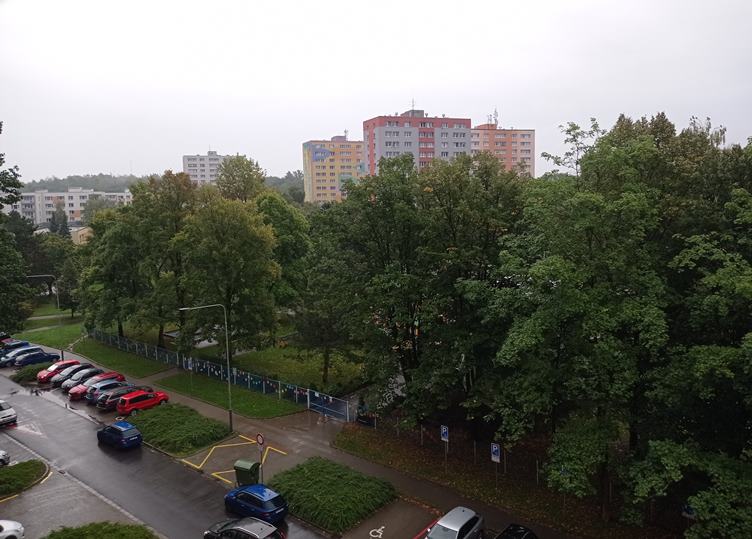 Čekání na trolejbus. Vystoupil jsem na zastávce a už mě čeká jen cesta na pracoviště. Prší.
