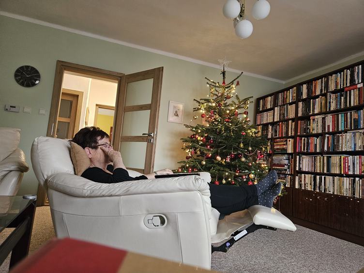 Neděle 4.1.2026 Je po svátcích, balíme se, hurá. Ještě světýlka za oknem. Bárt se jde počívat s babičkou do sklepa. Hra na postřeh, do vlaku třeba. Fotím staré fotky, tohle je svatba mé babičky Anny. Sledujeme film o Zemi, přemisťovaní nosorožců helikoptérou je fascinující. Ještě přeparkovat traktůrek do garáže a frčíme do Prahy. Překvapení, je tu sníh!