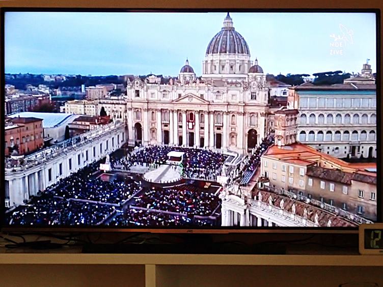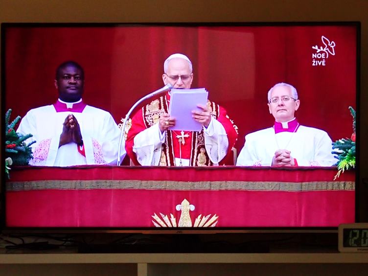 Krbová kamna drobnými větvičkami a polínky naplněna... Mozzarella z Tesca - třeba pravá italská mozzarella di bufala s tousty a zeleninou, možná z Toskánska... Místo nýtku nebo šroubku jsem ulomenou stranici u brýlí připevnil ohnutým špendlíkem - zatím spoj drží, stejně jako první... Přímý přenos Urbi et Orbi vánočního požehnání papeže Lva XIV... Poté film Navždy a daleko v podání herců Toma Cruise a Nicole Kidman, když ještě byli manželé... Elektrické svíčky na stromku... Kunafa pistacia nic moc, chutná jako stará dobrá arašídová pochoutka... A rozsvícená nová lampa...