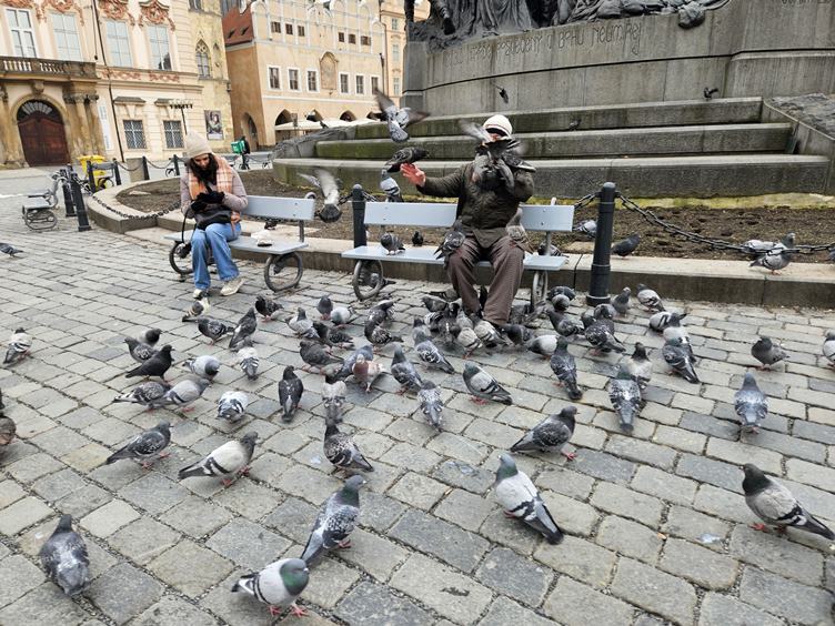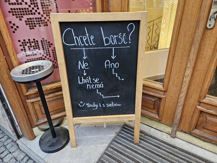 Pondělí 2.2.2026 Bárt jde kus cesty do školy sám. Heslo týdne v práci. Oběd Mezi řádky. Tady pracuju. Holubi muž. Cestou z práce mám čas, Bart se s Majdou zdrželi po cestě, maminka Msjdy se omlouvám. Hroši před mou alma mater. Ukrajinska restaurace Boršč na Strossmayeráku. Výzdoba na Vltavské.