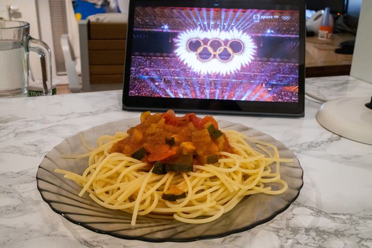 Snídaně. Venku to taje a sněhuláci se plazí. Vyšla jsem si na procházku. Vláknina. Zmasíruji jizvy, a pak protáhnu nohy. Ke špagetám zahájení olympijských her v Miláně. Proč je mi taková zima? Měsíčková mast má práci.