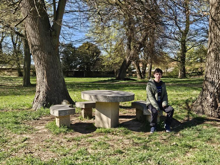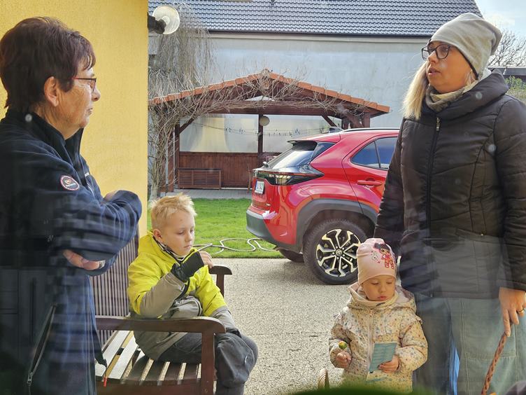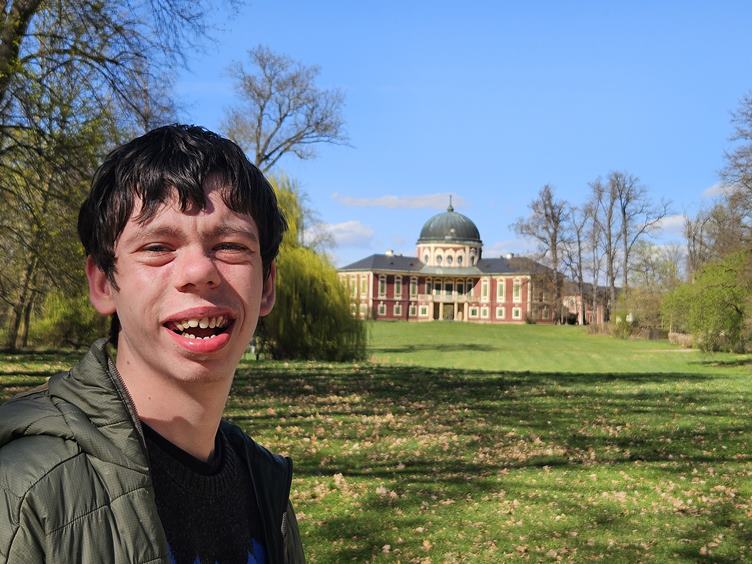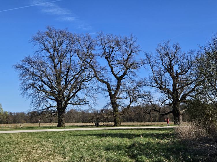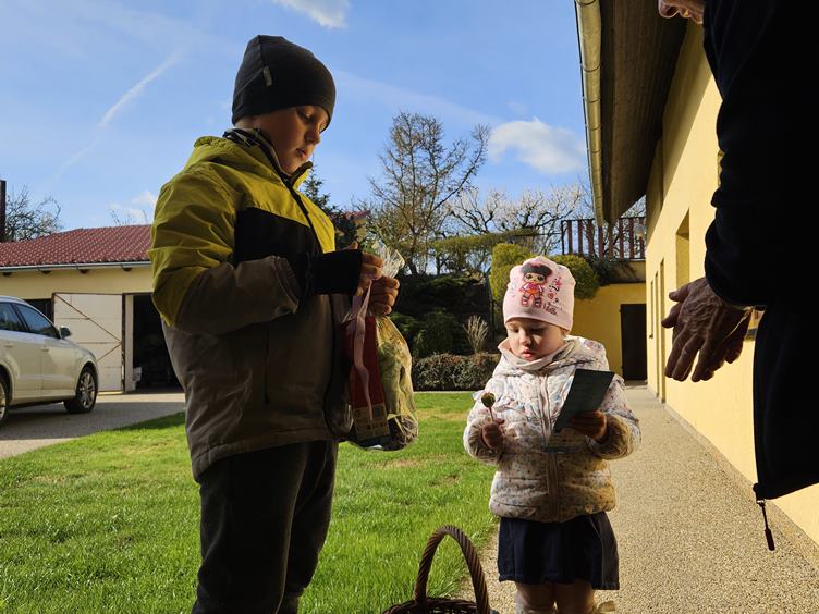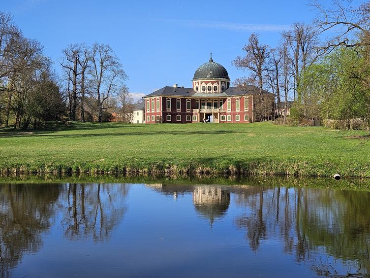 Pondělí 6.4.2026 Velikonoce neslavíme, koledovat mohly jen sousedovic děti. Rozkvétá broskvoň. Anička se přišla podívat. Cestou do Prahy zastavujeme ve Veltrusech. Zámek vypadá skvěle a procházka po parku se povedla.
