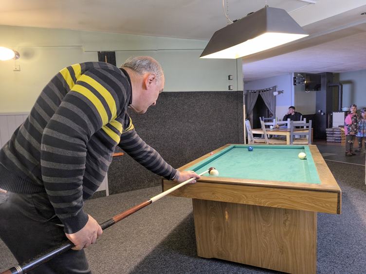 Čtu si, griluji, připravím se na večerní klání, Hele se učí, má klid, jdu s Vláďou si zahrát kulečník. Tady mají zelenou Litovel 11