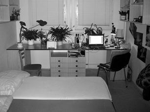 Východ slunce přes špinavé okno. Východ slunce přes půllitr s čajem. Snídaně. Fascinace čajem - ovocná Saga, sušená máta. Učení s kamarádem na poslední zkoušku. Vybydlená a zabydlená půlka pokoje. Pohled do "čerstvě" polovybydleného pokoje.