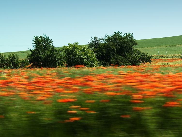 Po delší době se jedeme podívat na Záhlinické rybníky. Projíždíme návsí a jsme u nich. Na prvním je stále stejný strašák, jen unavený, naklání se a původně červená mikina vybledává . Je tu plno žab, kuňkání ze všech stran. Krásná klidná hladina. Na dalších rybnících jsou labutě, některé přelétávají z jednoho na druhý. Je horko.Laně se schovávají ve stínu. I my jsme unaveni a tak se pomalu vracíme domů, jedeme kolem pole,kde je plno máků. Musím se sem ještě vrátit. Odpoledne jsme byli navštívit malého vnoučka, ale zapomněla jsem fotoaparát, takže dnešek jenom záhlinický.