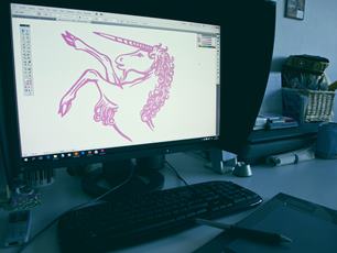 Zatažený den. Jdu na návštěvu za kamarádkou a její 3měsíční dcerou. Jdme na dlouhou deštivou procházku. Mám krásnou práci – kreslím si růžového jednorožce :-) Pracuju až asi do 11 večer. Pro štěstí.