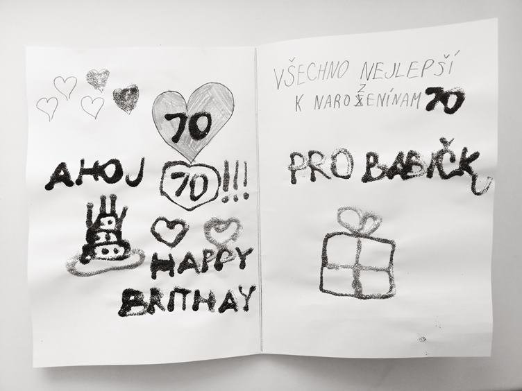Ranní krmení. Lenička vytvořila pro brněnskou babi přání. Slaví dnes totiž 70 let a celý den je ve znamení oslavy. Nejdříve oběd v restauraci a poté až do večera u nich doma.