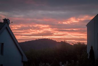 Ráno fotím z domu opačným směrem. Východ. Vracím se z Moravy z prezentace. Na náměstí je nějaký festival jídla. A na druhém náměstí nějaké sportovní odpoledne. Je výhoda mít kancelář v centru města.