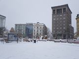 Čtvrtek 14.1.2021. Tak na dnešek napadlo tolik, že auto ani nevyhrabáváme a jedeme autobusem. Sníh na náměstí. Odpoledne sníh na Městském stadioně, míříme po měsíci na rehabilitaci. Autoportrét s respirátorem.