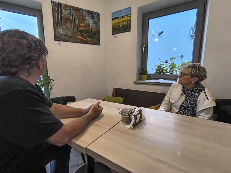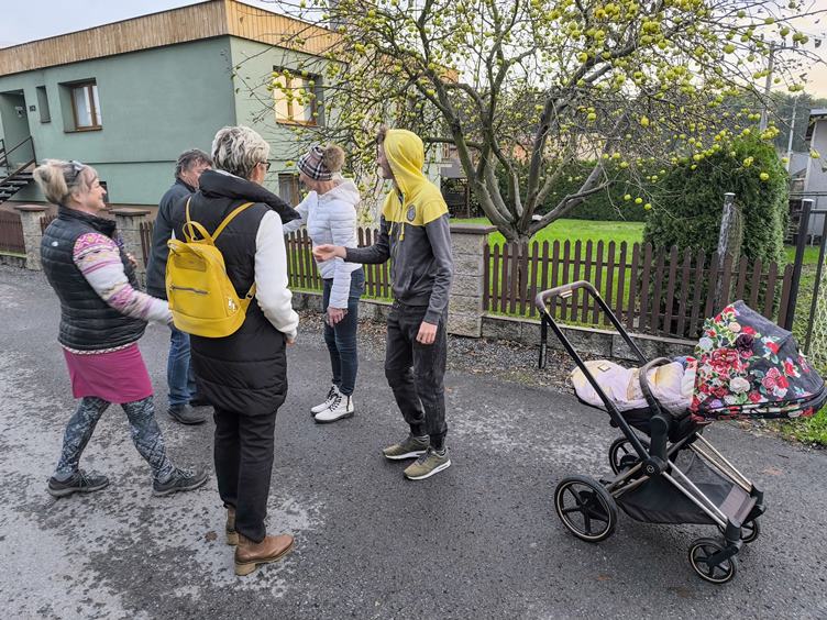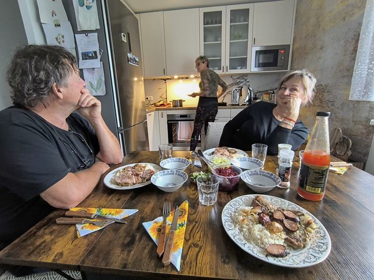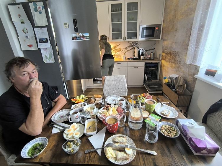 (1) Honzovi je už lépe, ale akci rušíme (2) Jdeme se projít i nějaké hřiby najdeme (3) Tady by se dalo plavat (4) Oběd (5) Vlak už jezdí (6) Zavřeli nám pekárnu :-( (7) V Monikafé se zastavíme ne kafe a zákusek. Je to naše premiéra. Zdence se líbí obraz a jde ho hned koupit (8) Potkáváme Míšu s Vojtou a malou Emičkou. Musíme naše přátelé seznámit, tak jdeme do Zanzíku