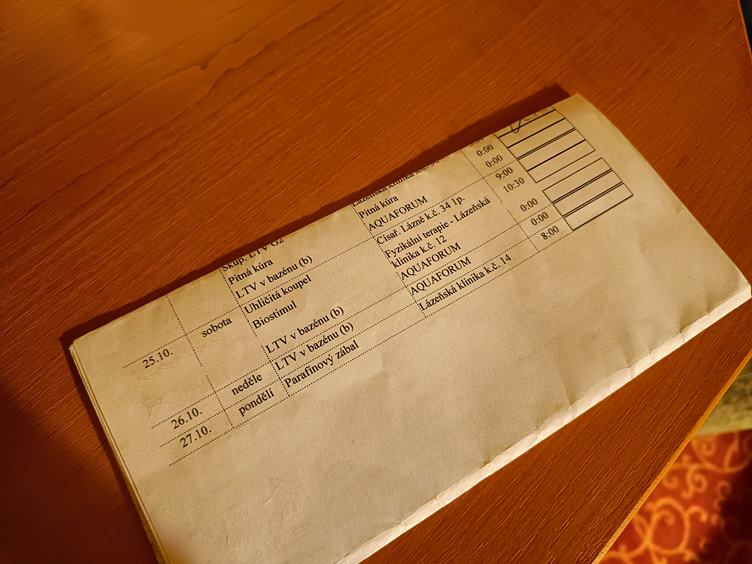Jdu do slatinné koupele. Z tělocvičny koukám na bazén. Utíkám z procedur, co nejdříve to jde. Domluvili jsme se s Hankou, že vyrazíme na Seeberg. Cestou potkáváme veverku. Počasí se hodně mění, ale nám docela přálo. Stihli jsme příjemnou prohlídku, kterou jsme měli zpestřenou strašidelnou výzdobou. Cestou zpět jsme se stavili pro něco hezkého na sebe. A teď už jen vymyslet program na zítřek.