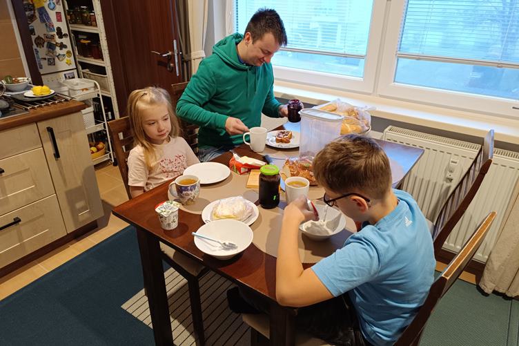 Po obede sme zašli s kolegami na kávu. Po práci som vyzdvihol Samka na plávaní. Ľudka piekla a Dianka maľovala.