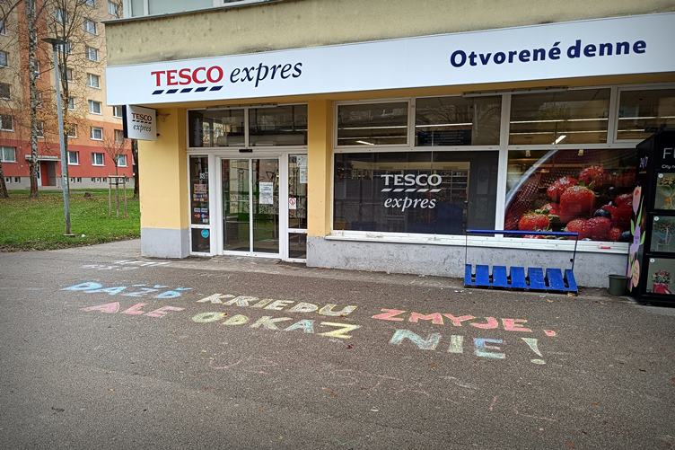 Kriedové nápisy boli aj pred Tescom. Večer sme vyraďovali staré topánky.