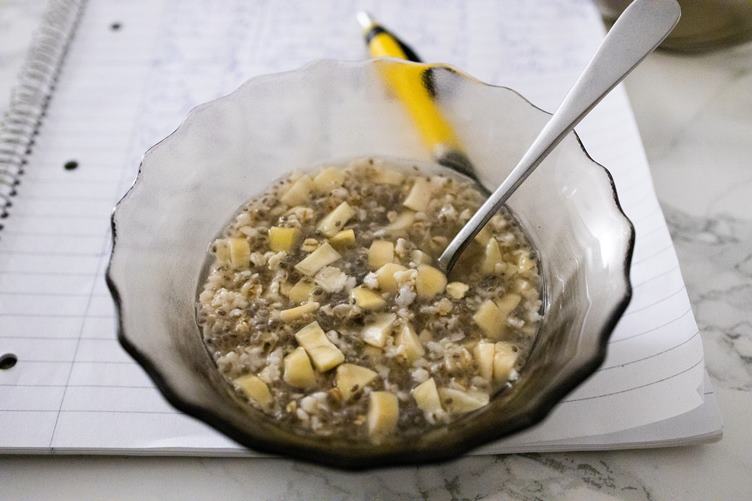 Stáhnu fotky a trošku na nich zapracuji. Nové hůlky šlapou dobře. Posiluji nohy chůzí. K jídlu je hummus. Můj nákup už se blíží. Zacvičím si. Malá sladká odměna. Připravím si snídani a je konec dne.