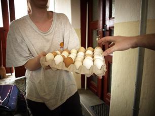 Pitný režim. Zaujal mě igelit, v kterém byly zabalené grafické papíry. Jedeme k Zuzce pro domácí vajíčka a brambory. Pak k Pepovým rodičům. Mamka nám ukazuje složené puzzle, na kterém jsem já s Pepou na Lipně (puzzle jsme jí dali k narozeninám). Cestou domů pozorujeme obědvajícího havrana. My budeme mít bramborovou kaši. Prší. Domácí práce. Večer se díváme na Obecnou školu a popíjíme sekt.