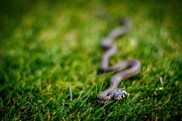 Musím na cesty. Je ráno a všude se válí mlhy. Hele užovka. Domča jede zítra do Británie, tak jdeme na rozlučkovou večeři.
