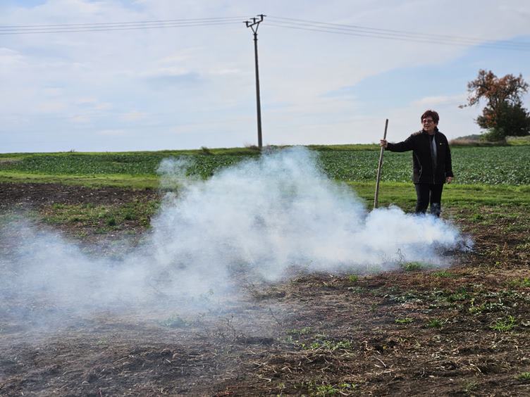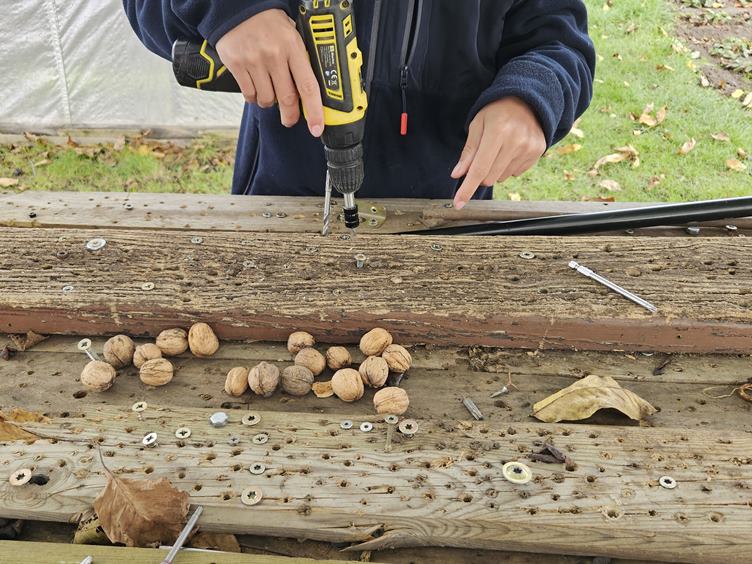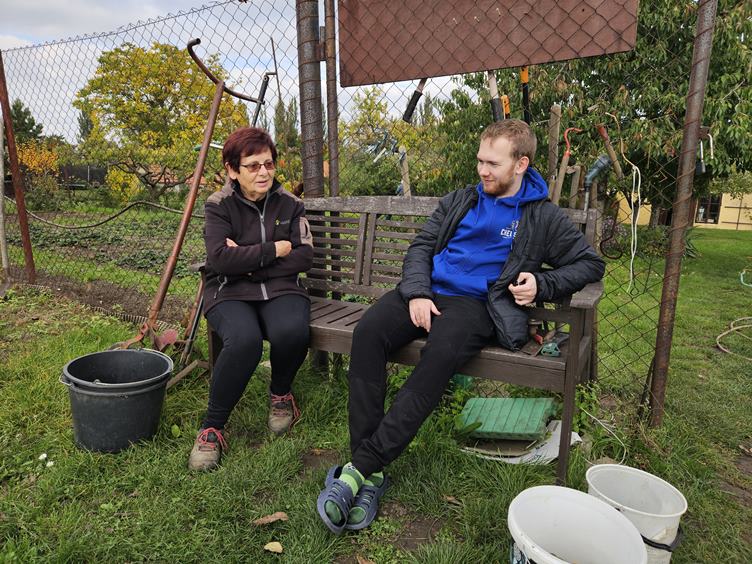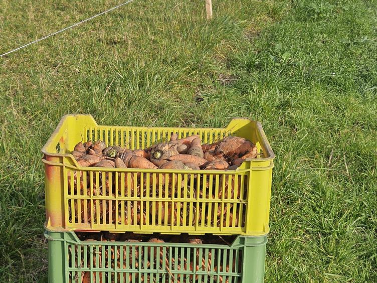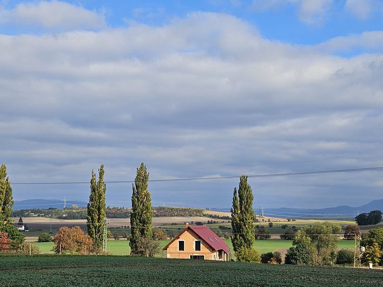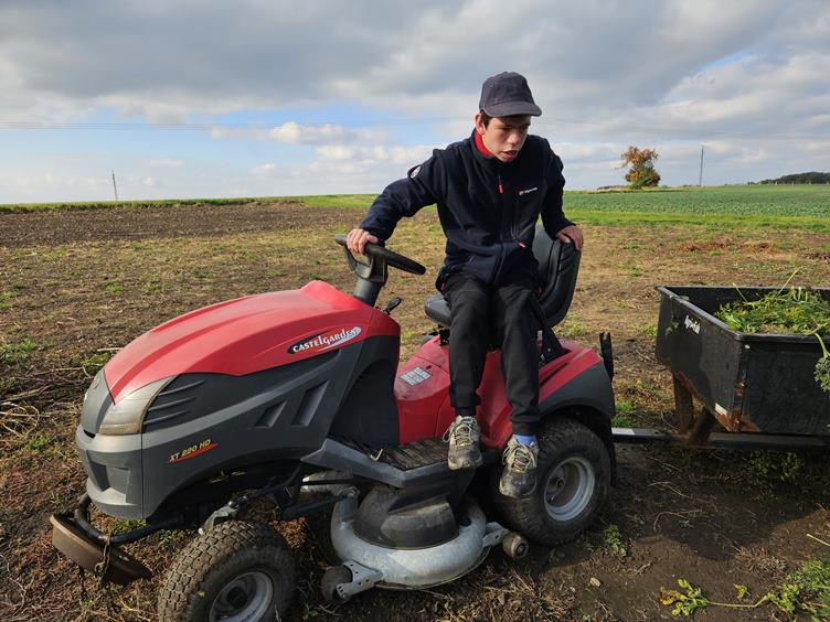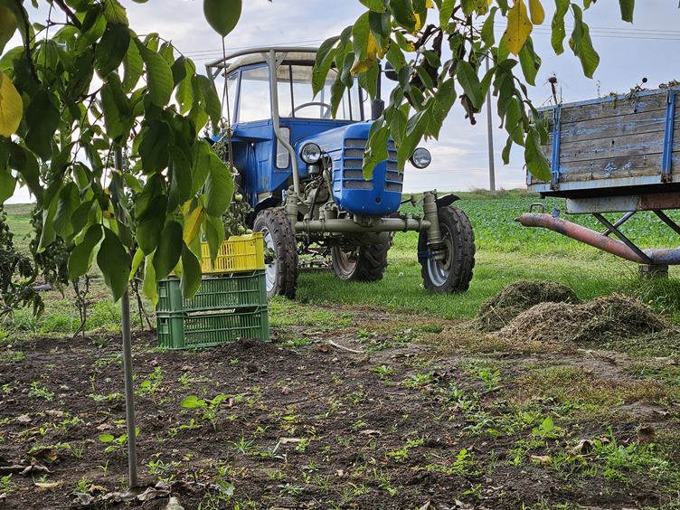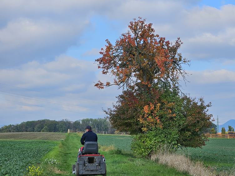 Neděle 12.10.2025 Kiwi, vyjížďka, docela se vyčasilo. Mrkev pro koně. Vrtání pod stromem. Pan student Tonda se na nás přišel podívat. Pálení větví. Zátiší s traktorem.