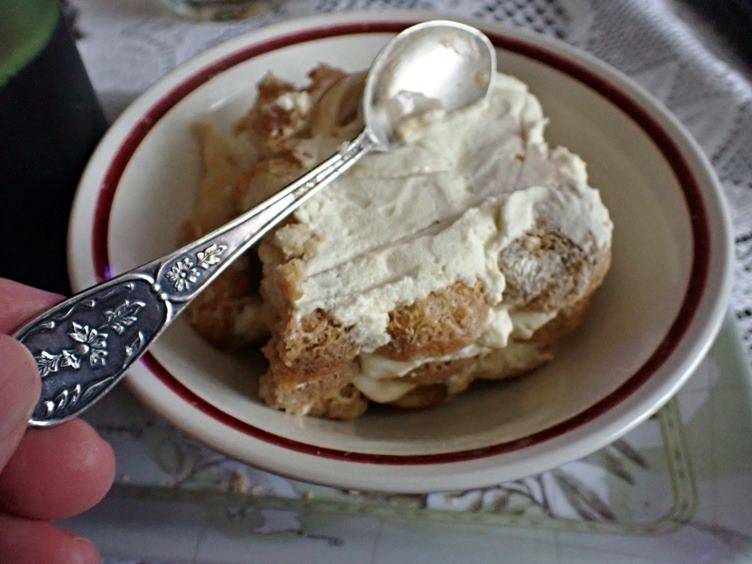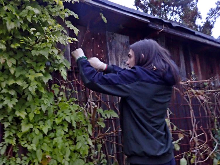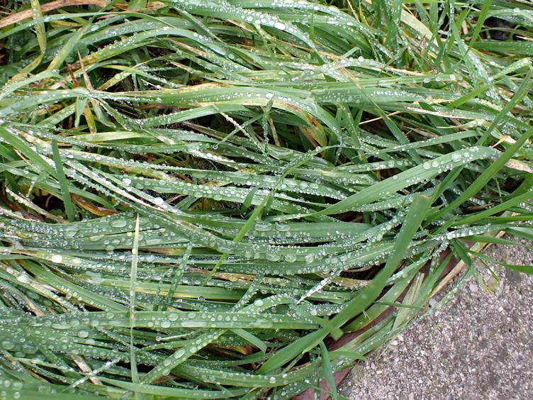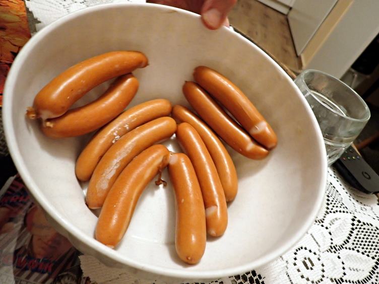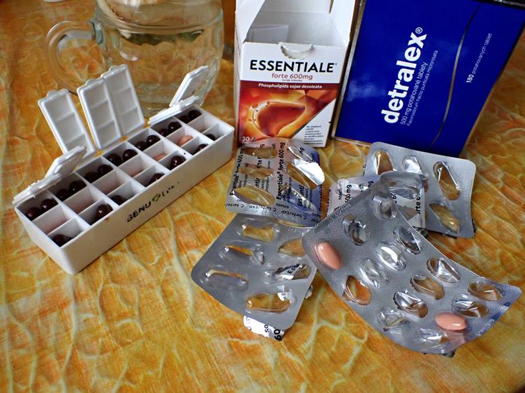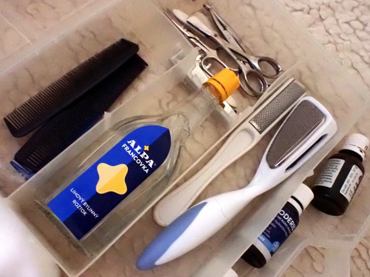 Hygienické propriety... Rozdělování léků... Tiramisu ke kafi... Na dvoře: mokrá tráva, odkvetlá (asi) pampeliška a kapradí... Kočka na truhlíku... Ondra s nůžkami na popínavkách... Párky z mrazáku...