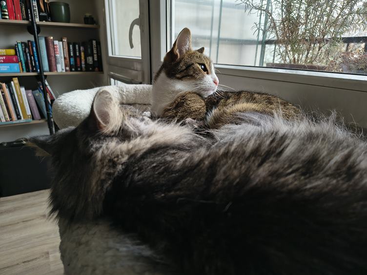 Dneska od rána epesně chumelí, doplňuju mlsy ptáčkům. Konečně je mi po týdenní rýmičce zase trochu líp, jdu tedy na další zdravotní procházku a konečně odevzdat knížky do místní knihobudky. Pro velký úspěch se znovu prohrabávám poděděnými dětskými oblečky, je jich moc a jsem z toho nějak přehlcená, hlavně z těch, co nemají uvedené velikosti. Muž přišel z práce a opět hrajeme Rone, abychom se rozhodli, zda chceme koupit rozšíření pro víc hráčů. Peču cuketový perník, kočičky na tom nejvíc přirozeně zajímá ta šlehačka.