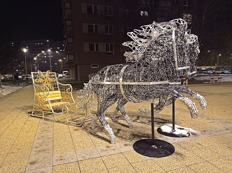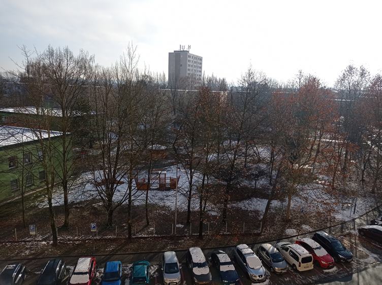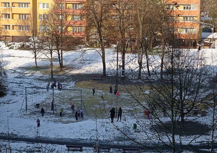 Děti ze školky přišly na hřiště. Dopoledne. Hraji. Oběd. Výloha v centru Ostravy. Po práci jsem došel na zastávku trolejbusu. Na náměstí před poliklinikou v Hrabůvce, Sleduji skvělý basketbal. Noc.