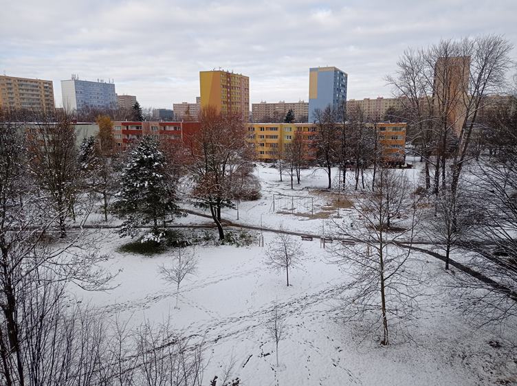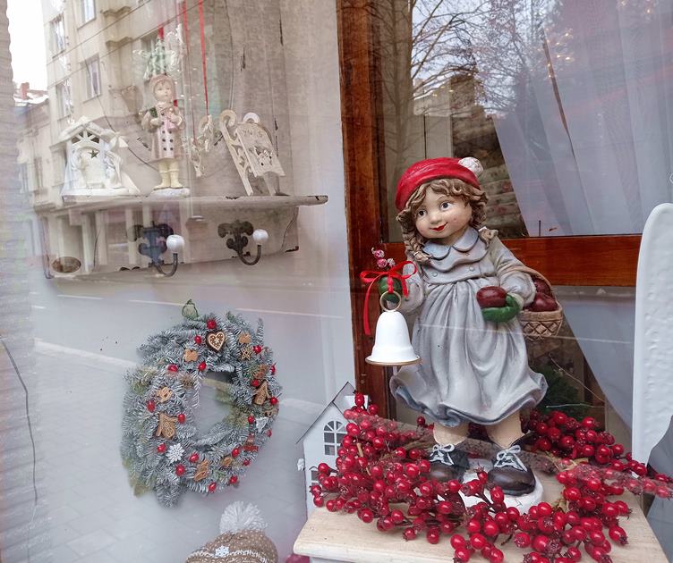 Dopoledne. Oběd. Trochu se oteplilo. Betlém na Kuřím rynku. U ozdobeného stromu na Masarykově náměstí. Výloha poblíž zastávky u Sýkorova mostu. Čekám po práci na autobus. Vážení. Hraji.