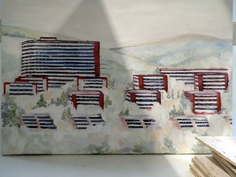 Nové hrušky podél silnice.... Výtvarka: kočka s krajinou, okna a špice a sídliště na plátně a stejné v reálu... Oběd... Švédský film Muž na střeše (dost hustý!)... Vánoční pečivo přibývá...