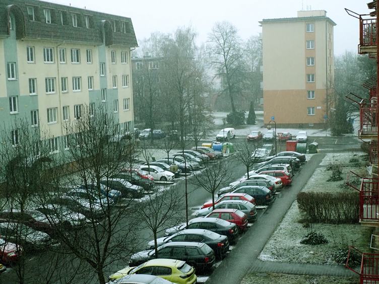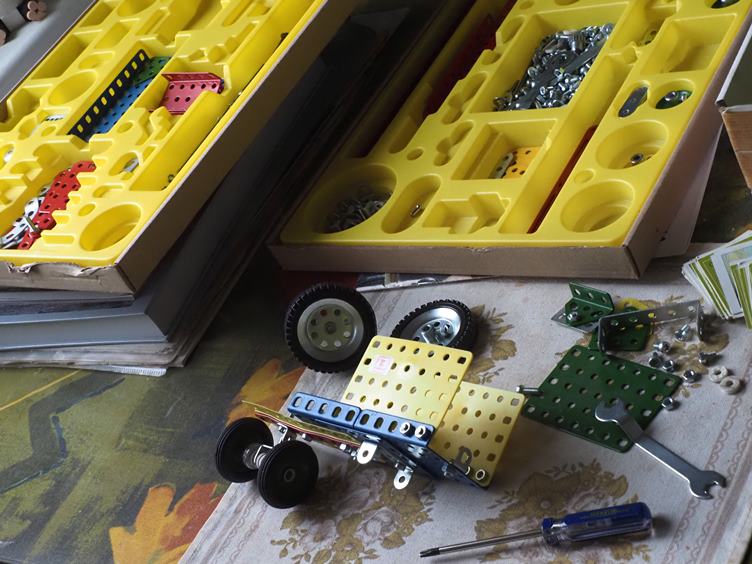 Děs a fraška už od rána...proč já blbec to musím tak intenzívně prožívat!...Uklidním se u stavebnice Merkur, jejíž občasné modifikace mě provází celým životem...tato zánovní verze patří pětiletému vnoučkovi Oskarovi a dost si u ní společně pohrajeme...Když otevřu dveře na chodbu, ocitnu se na staveništi, revitalizace našeho paneláku jde do finále...A venku tiše sněží...