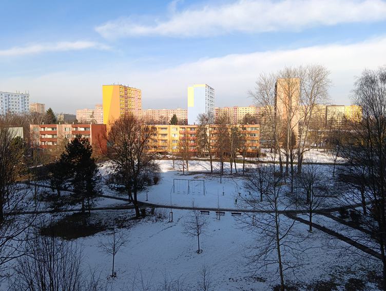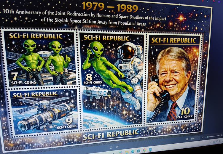 Mrazivé ráno. Oběd. V Husově sadu. u místního kostela. Trolejbus stojí na zastávce u Mostu Miloše Sýkory. Udělal jsem jakoby výroční aršík, motivovaný líčením události v knize Kyriaca Markidese, ke kterému jsem "přidal" telefonát prezidenta Cartera s obyvateli vesmíru. On sice po události telefonoval, ale do Austrálie, kde se omluvil, že některé zbytky Skylabu dopadly do blízkosti města Perth /bez tragických následků/. Noc. Je velký mráz. Youtube.