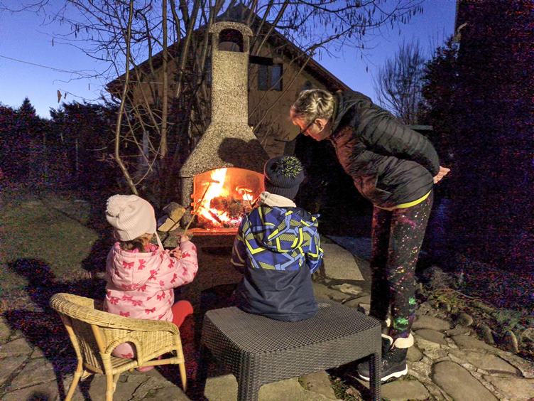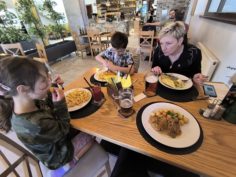 Mladí jsou na wellnessu v Polsku, jsou jarní prázdniny a my hlídáme děti. Jdeme pěšky do F-M kolem řeky. Stavíme se na oběd k "Medínkovi". Výborně vaří a mají tam i zábavu pro děti. Přejedeme přes lávku a kousek je hřiště, které je otevřené, restaurace zatím ne. Přejdeme další lávku, tentokrát přes Ostravici, ve "Vagón Cafe Baru" si dám pivko a zbytek poháry. Mají tu velký výběr alkoholu, vyzkoušíme skvělou italskou grapu. Nechali jsme Robinovu bundu na hřišti, Hela se pro ni vrací. Dám si mezitím pivko v Restauraci U splavu a děti řádí na skluzavce. Čeká nás cesta na nádraží a zjišťujeme kde začíná válka. Večer opékáme buřty