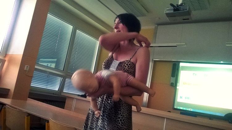 Jeje, první velká krize, ani ne tak fotografická, i když to taky za moc nestojí, "chytrák" je jen telefoun..Ale hlavně emoční krize se dostavila..Ráno konečně vidím, že i hovnincové koše se občas vyvážejí, pán se teda moc netváří, ale kdo by tohle dělal s nadšením, že?..A když se dusí, klidně mu flákněte pár ran do zad:-)))Samo, že takhle to záchranářka Lenka neřekla ani náhodou..Ale podle fotky to tak vypadá:-)Opět v akci, dýcháme a masírujeme, že bychom už vzkřísili snad i faraona a jeho rodinu:-)Nicméně, chvílemi jsou to dost depresivní pohledy, na tu katedru, nehybný kojenec se tu o pauze jen tak válí..Konečně to školení končí a já..Prchám podél umoklých poničených zdí s hesly strašlivými na tramvaj a fičím do opravny s Canonkem..Chvilku jsem byla napínána opravářovou dočasnou nepřítomností..A konečně pán, co mi ho uzdraví..Bude to stát sice majlant, ale co byste pro svého druhého nejvěrnějšího přítele neobětovali, že. A je to v prdeli, jsem bez aparátu. Nadlouho..