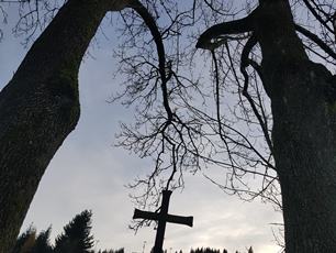 Středa 18.11.2020 - po měsíci do školy. A odpoledne na vycházku do Bedřichova. Z Maliníku jdeme po Vysokém hřebeni. Dost se tu kácí, jako všude. Selfie. Cíl: křížová cesta Trniště a bývalá Hašlerova chata. Zastavěnou částí Bedřichova pak zpět. Na horách je pěkně.