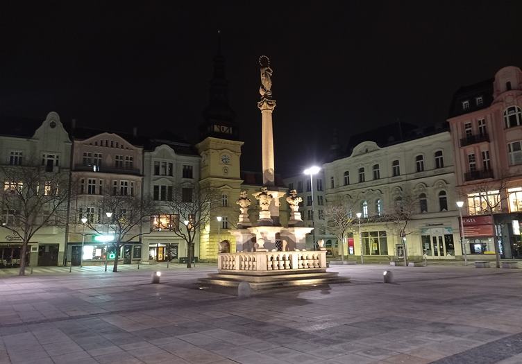 Naše sídliště nepatří jen lidem. Oběd. Holub na Masarykově náměstí. Cestou přes náměstí. Ve výloze starožitnictví poblíž Sýkorova mostu jsou krásné veteránské motorky. Hrušovský kostel je na noc osvícen. Cestou přes noční náměstí. Dnes jsem koupil tuto pohlednici. Pivo.