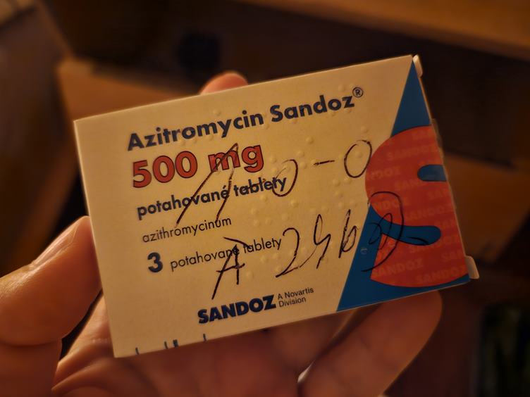 Už ten náš mizery stav trvá dlouho, jedeme na CRP. Zrcadlo, kdo je na světě nejnemocnější a dostane proto antibiotika? No já, přece. Při čekání v čekárně reportáž o očkování proti žloutence. No, nám to byl trochu čert dlužen... Vtipná nálepka. Leje. Najeto od července. Bárta bolí břicho, aby ne, když nejí a cpeme ho léky na horečku. Kňourá. A za okny se po měsících nečinnosti dává do pohybu stavba silnice, zázrak.