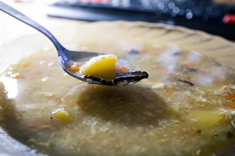 Část mé snídaně. Jdu se projít ven. Po návratu jsem si pustila koncert. Dám si bramboračku. Peru prádlo. Objednávám potraviny a trocha terapie.