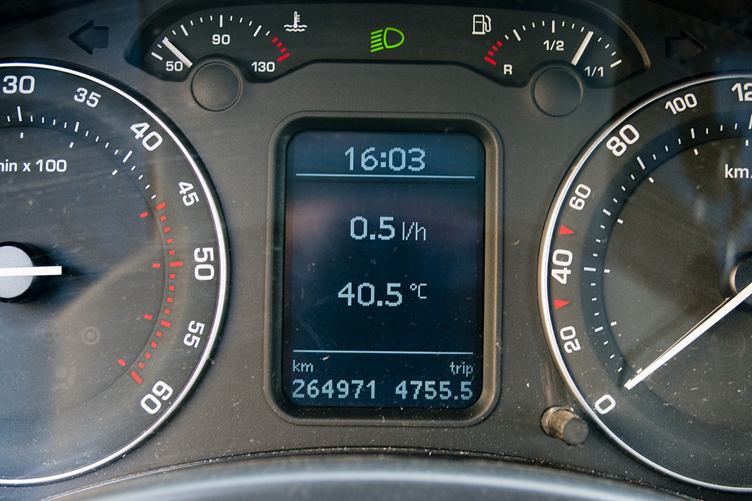 ráno cestou na poštu ... potom na oběd ... z oběda (nejsem tak trochu voyer) ... vedro, už se mi taví mozek ... v autě je nádherných 40 ve stínu ... cestou domů potkávám frontu Oktávek ... stavím se na chalupě (na řízeček :) ... Parking ... kočka loudí šunku ...