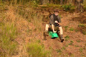 Ráno jsem sesmolil trasu výletníků a poslal Evě s Bramborem.Oba souhlas, takže v půl jedný se razilo od krámku, vlastně dýl, protože Eva si spletla krámky :D Jak vidno, v lese se nám nějak divoce rozrůstá chmel, jinde vznikají nové fosilie.Kousek před Janovem srnka.Za Janovem silnice, pěkná, nová, ale raději nahraju další zelenou.Teda cestu ke kostelu svatého Jana Křtitele, hlavnímu cíli.Ne, malby nejsou původní. To už se pomalu ztrácí peklo ze stěn.Před lety se tu točila pohádka. Od kostela silnicí ke Kočovu, kde nějaké dobrácké dítě nechalo sáně. Tudíž nám Brambor hned mohl demonstrovat, že zimní sporty se dají praktikovat i v létě. Z Kočova nás vzala Ája co jela z práce a šlo se na odměnu.Tady jsem si nechal pauzu na focení,abych to půl kilové maso srovnal.