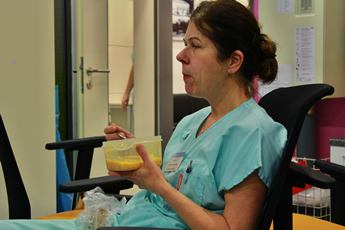 Terka si při odchodu zase hraje s kocourem, Vlaďka uplatňuje strategii posledních dní - nažer se dokud můžeš, já si instinktivně křížím nohy jako výraz bojkotu pracovního statusu. Věruška se nám schovává za asák, ne že by takovou sračku četla, ale nechce se fotit jako vždy´. Lucka mi v práci nechala Instinkt na přečtení - co myslíte, že jsem z něj stihla přečíst? Ano správně, mega velké, hnědé a zakroucené háčko! Ale někdo na mě myslel a schoval mi kafe ze snídaně. Jinak tradičně mám hrnky snad všude. Jako svědomitá vedoucí směny si píšu, co je potřeba předat další směně, popřípadě její vedoucí části. Taky jsem našla ve skříňce starej nákup a přesně si pamatuju, jak jsem ten lístek hledala....