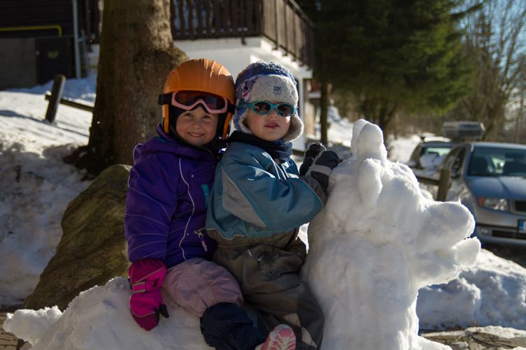 Ráno nesněží, naopak místy vykukuje sluníčko. Takže jdu běhat. Odpoledne svítí pořádně, takže stavíme... formule, kráva, klouzačka s klopenkama. Večer jsme o kus víc unavenější než děcka :).