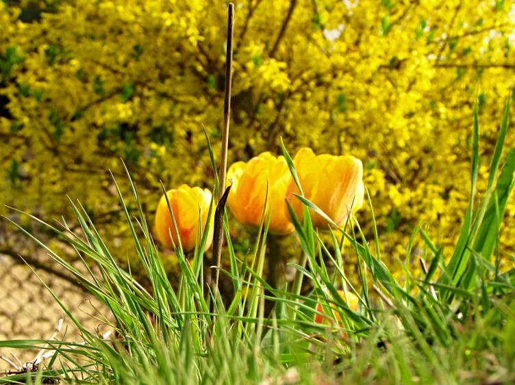 K obědu budou palačinky - Andy se posilní a pak se učí otáčet palačinky nadhozem :-) Ruda se nacpal trávou a odpočívá, nastříháme si tulipány domů do vázy, ať si je pořádně užijeme, obloha dělá šlehačkové kopečky a foto ze zahrady..