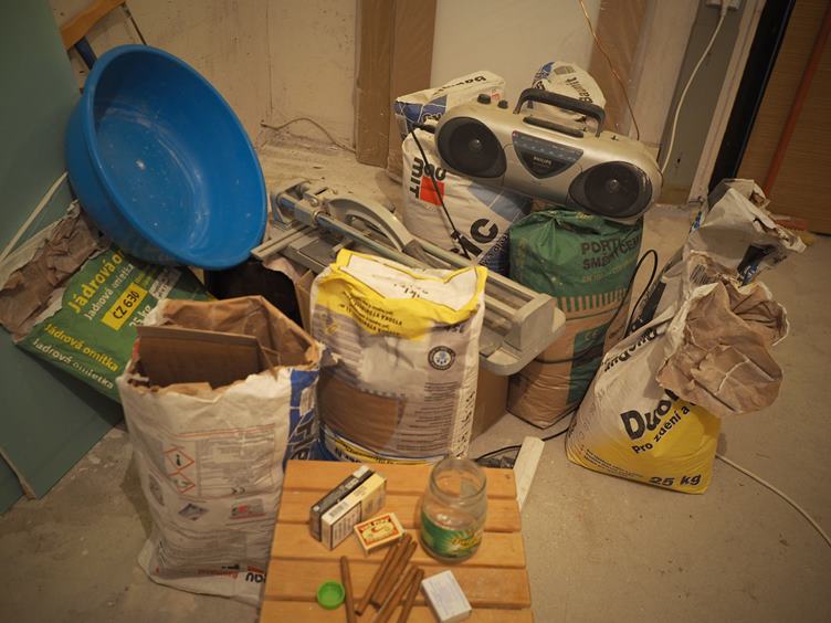 U závěrečné zkoušky jsem dostal za úkol zadokumentovat daktylky mrtvého narkomana... A doma pan Maňák pokračuje... Přinesl si lépe hrající rádio... Už je vydlážděná jídelna... Pořád však musí řezat další dlaždice a přes prach se přitom moc nevidíme... Vana je v ytongu... A večeře z konzervy, s ubrousky...