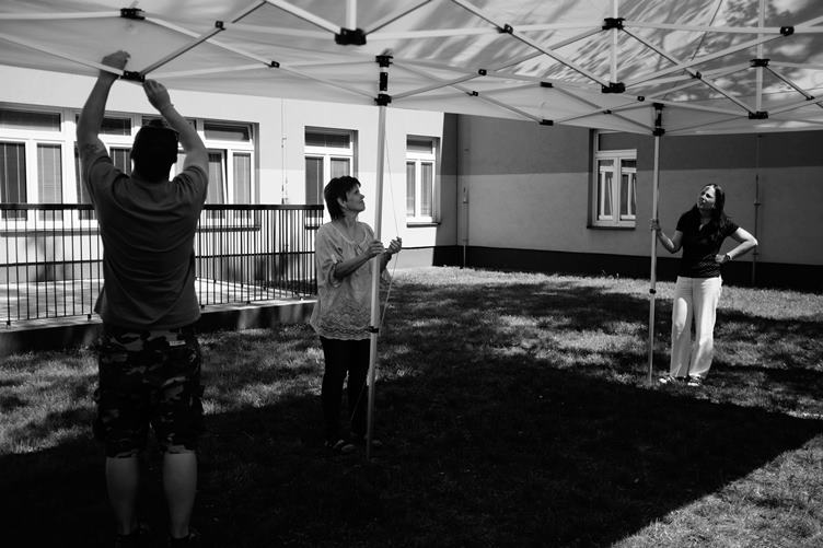 je tu pondělí a to znamená jediné - do práce! :) dopoledne máme cvičné stavění stanu, a že nám to jde :D Anička fotí a stopuje čas, a my posloucháme instrukce :D Jitka neztrácí úsměv (ale to ona nikdy! :)) odpoledně mě čeká terén... a nakonec jsem se odhodlala to risknout a pořídit Přemkovi narozeninový dárek :) je fajn mít na to spolehlivé komplice :D večer fitko a doma :))