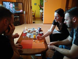 Ráno jedeme pro dort. Miška má narozeniny. Dostali jsme oběd hned jak jsme přijeli k Petrovým rodičům. Hrajeme si celý den.