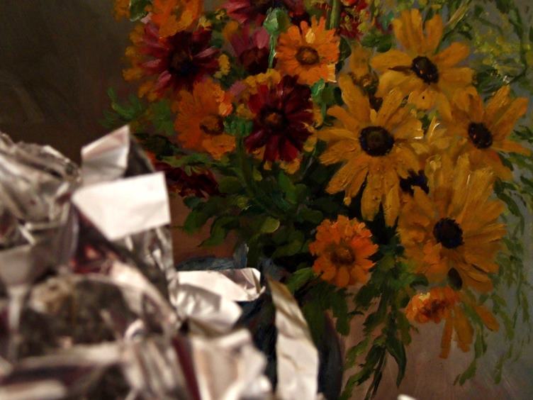 Ráno elektrické... Na zahrádce rajčátka a kopřivy... Kyblík na popel zatím prázdný... Květiny se staniolem... Ořechy pro ptáčky... Kufříky do Kodaně... A co tam na sebe...